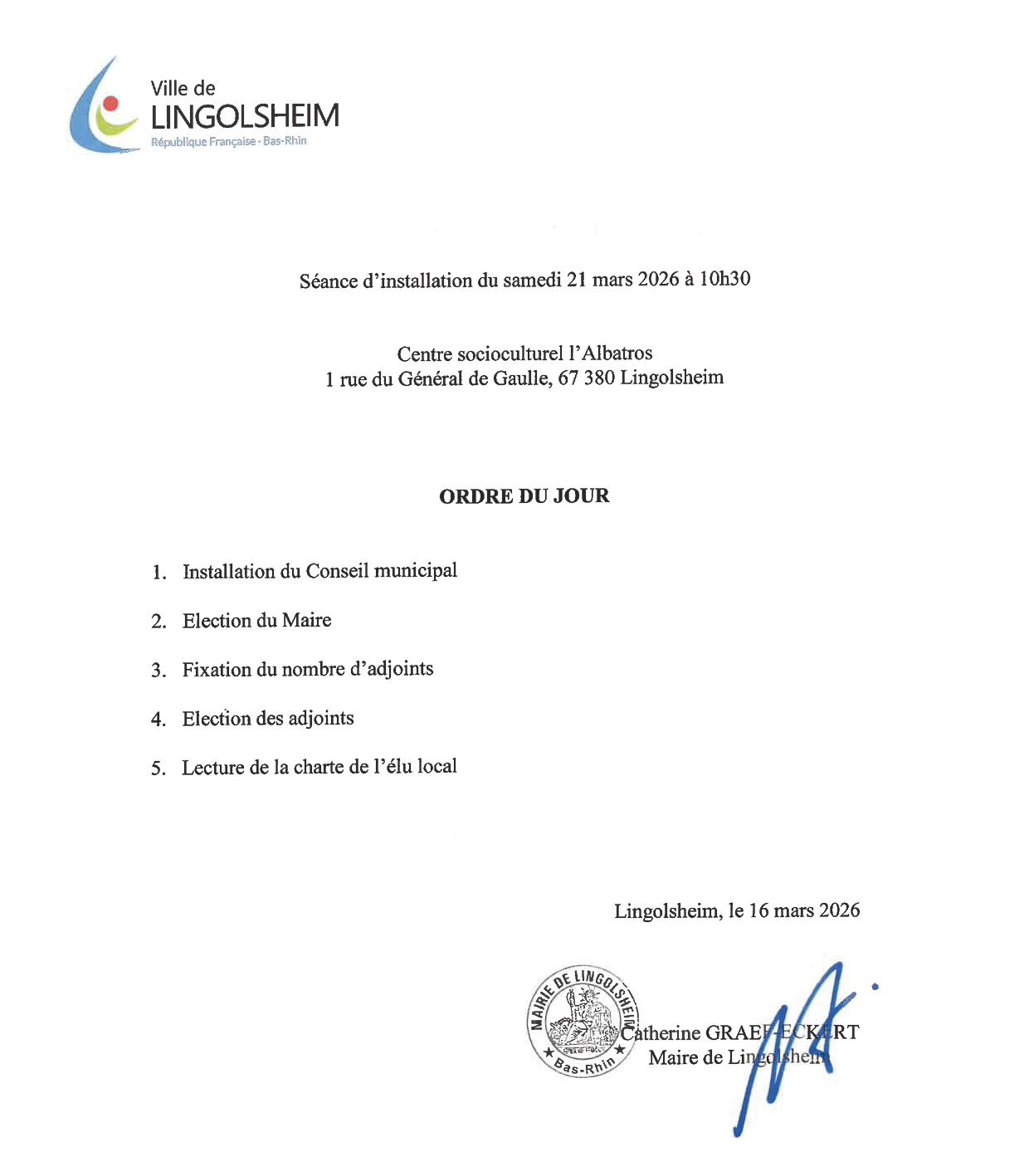La séance d’installation du nouveau Conseil municipal se tiendra samedi 21 mars 2026 à 10h30 au Centre Socio Culturel L’Albatros de Lingolsheim
