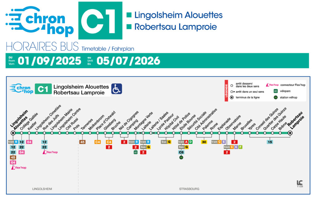 Les lignes C1, 2, 12, 22, 45 et 64 sont à votre disposition pour vous déplacer dans la commune de Lingolsheim et en périphérie (Entzheim Ouest, Illkirch, Holtzheim Ouest). La ligne C1 offre désormais plus d’horaire, toutes les 7 à 8 minutes en heures de pointe et toutes les 10 minutes en heures creuses, et devient plus rapide pour rejoindre le centre-ville de Lingolsheim. Il est à noter que l’itinéraire de la ligne 45 a été rallongée vers Eckbolsheim à partir du 29 août 2024.